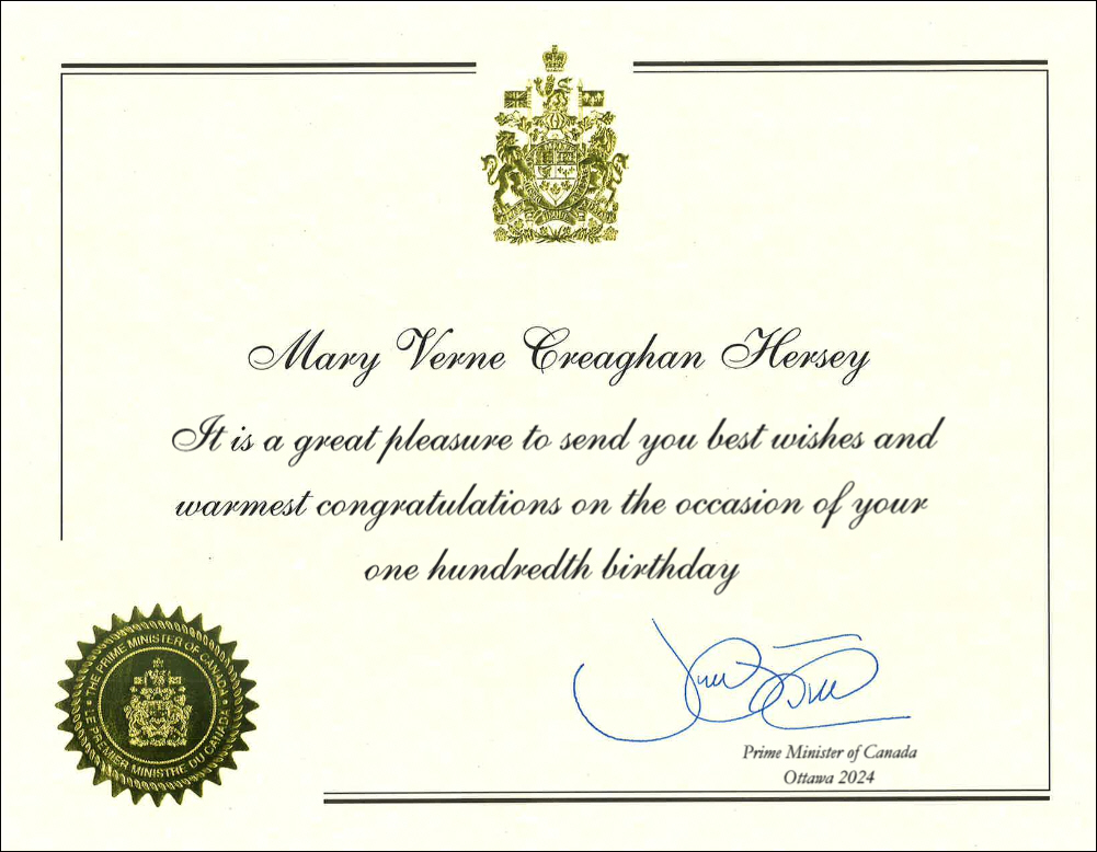 Mary Creaghan Hersey Celebrated Her 100th Birthday on August 12, 2024.