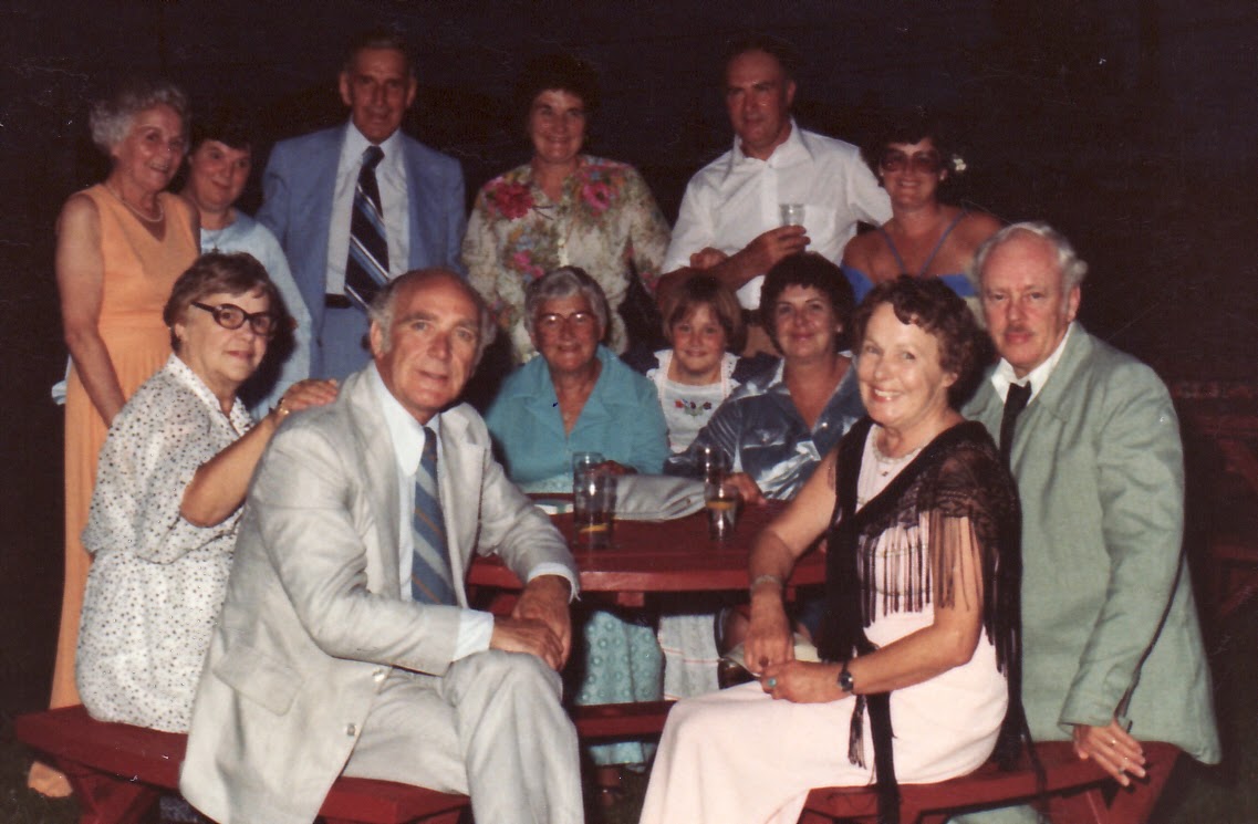 This photo of Thérèse and her four remaining siblings was probably taken in the late 1960s. Back row: Sister Berthe (Bertha) Giovannetti, niece Ann Giovannetti, brother-in-law René Gratton, Fran and Reg Giovannetti*, niece Anita Rowan. Centre row: Sister Angie (Angéline) Rowan, Bonnie Giovannetti**, Thérèse. Front row: Sister Tonie (Antoinette) Gratton, brother Loyola LeBlanc, sister Colombe Léger, husband Bill Creaghan.
