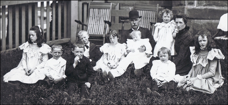 John Daniel Creaghan married Ellen Gertrude Adams on November 13, 1882 at St. Mary’s Church in Newcastle, New Brunswick. Here they are with their nine children in front of the Creaghan home on Prince William Street sometime in the late 1890s. From left to right: Clare, Jack, Don, Bun, Neen, Bill on father’s lap, Dew, Nan (standing next to her mother) and Mollie.
