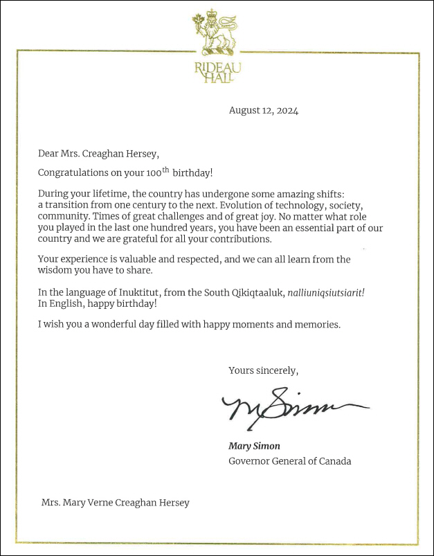 Mary Creaghan Hersey Celebrated Her 100th Birthday on August 12, 2024.